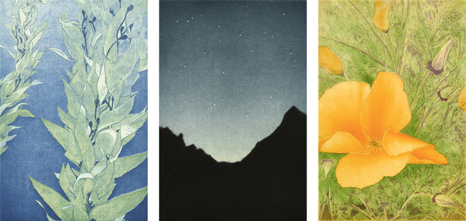 The snapshots I take along the way become reference images for etchings and lithographs. The slow, careful work of creating prints makes me observe more closely. I notice how poppies change in each stage of blooming, find a fish hiding in kelp leaves, and remember nights lying on campground picnic tables with each of our children, watching the stars appear.